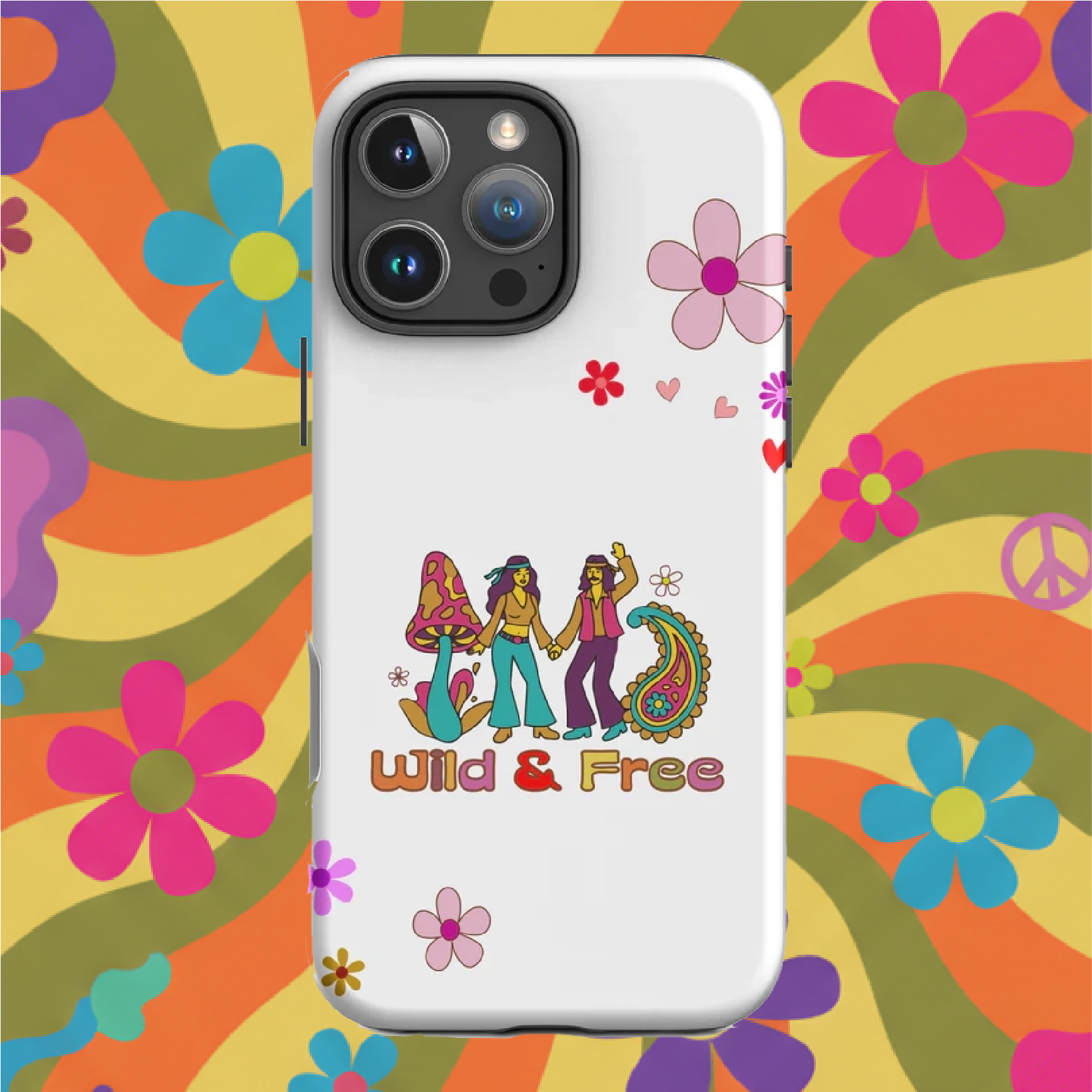 Embrace the groovy vibes of the counter-culture movement with this vibrant, psychedelic phone case. Featuring a retro hippie couple holding hands amidst a giant magical mushroom and intricate paisley patterns, this design perfectly captures the spirit of the 1960s and 70s.
